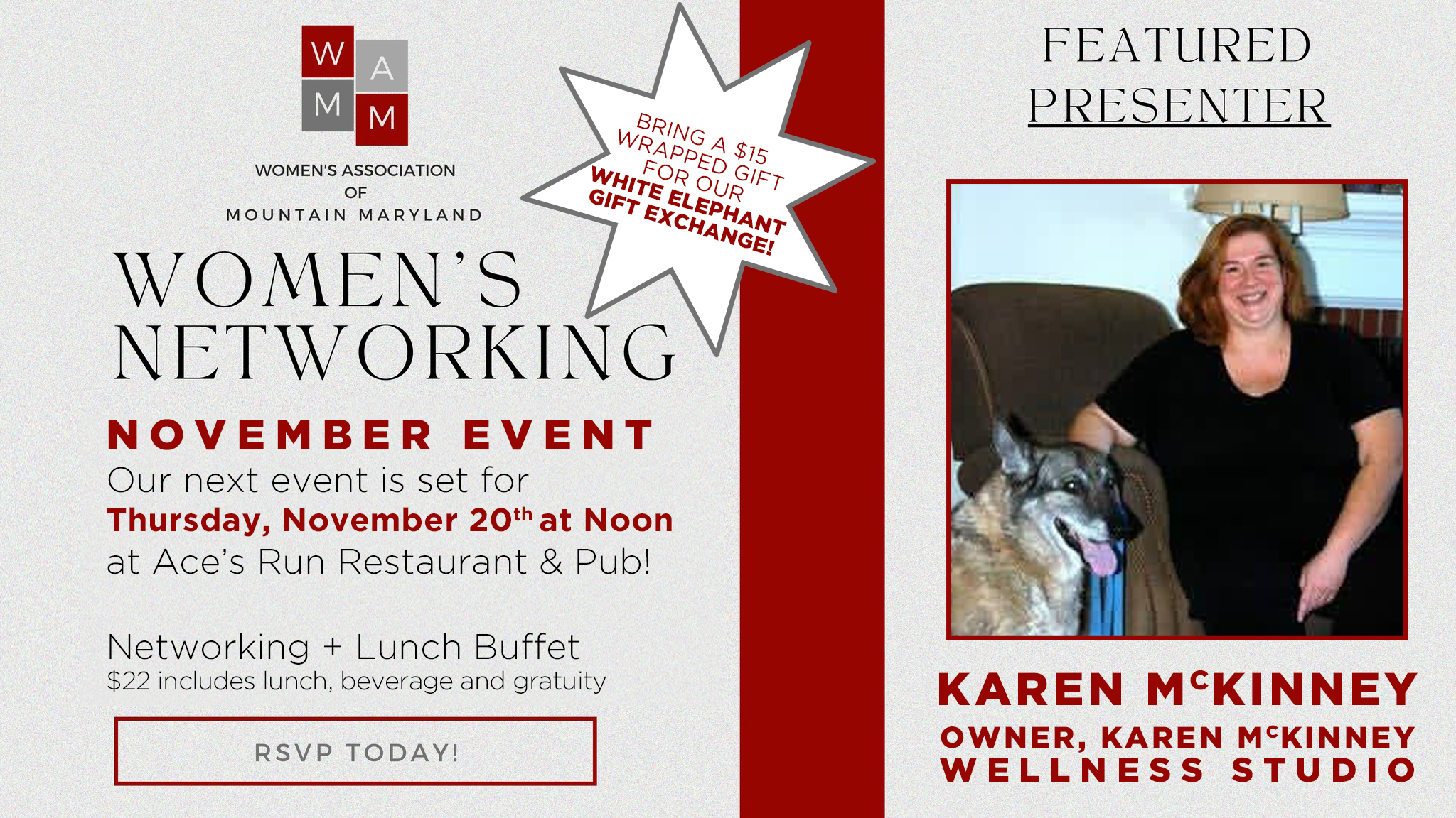 Join us on Thursday, November 20th for great food and conversation with some of the most incredible women in Garrett County at Ace's Run Restaurant & Pub! $22 includes lunch buffet, beverage, and gratuity This month we will be doing a special holiday White Elephant gift exchange! Please bring one wrapped item ($15 in value) […]