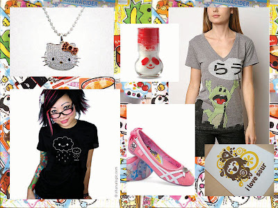Clockwise from top left: <Hello Kitty necklace, Grey Monster Shirt, I love sour Gocco Print, Tokidoki Shoes, Cloud Shirt and Background print