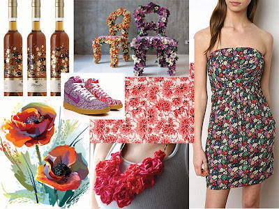 Clockwise from top left: Floralis Wine, Shoes, Chairs, Japanese Paper, Dress, Garland Necklace, and Vector Flower Illustration