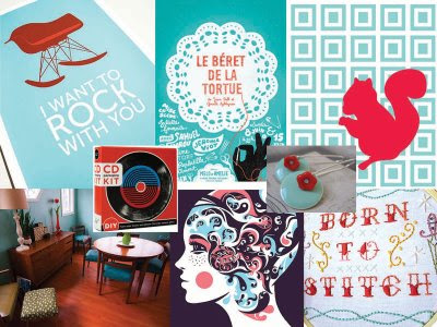 Clockwise from top left: Rock Chair print, CD kit, Doily Poster, Earrings, Squirrel print, Born to Stitch, Vector Woman, and Red & Teal Room