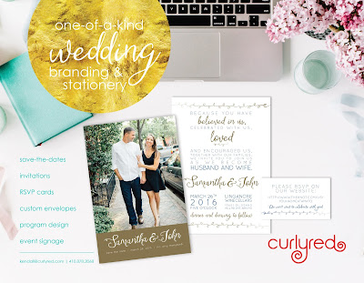 Even better, CurlyRed is going to be a vendor! Come see us as we show off our services, particularly in the area of custom wedding stationery, like these pieces we created last year: